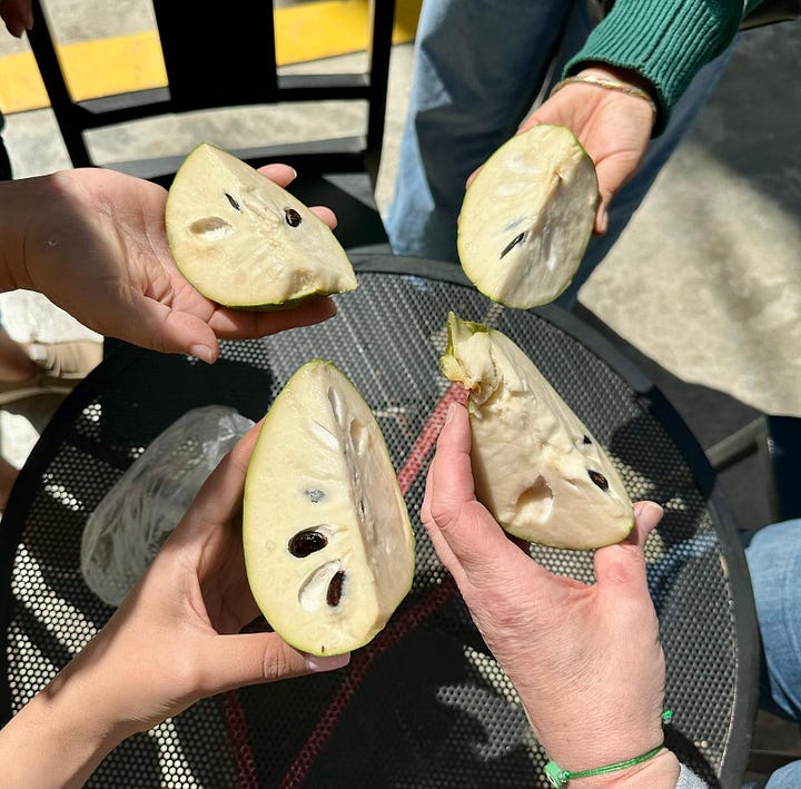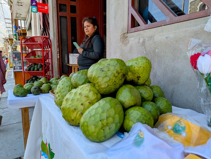 Chirimoyas are a local specialty here. The growing season typically runs from February to May, though in the cooler mountain climate of Callahuanca, it can stretch a bit longer. The fruit grows on steep sidehills, in neat rows carved into the landscape. Someone is out there tending that land, by hand, on rugged terrain. It is hard work, but it is also a way of life, and from what I could see, a beautiful one.