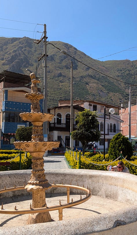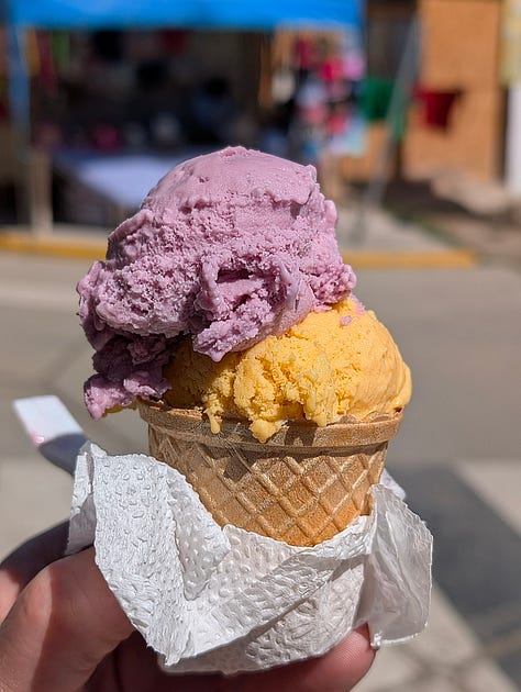 Callahuanca is incredibly quaint, a small mountain town known for its fruit orchards and peaceful charm. We stopped for ice cream soon after arriving. I chose a mix of chirimoya and blueberry. I did not realize at the time what a chirimoya was, but I was about to find out. Gabriela insisted that we try one. She led us to a small shop where the vendor sliced open a ripe chirimoya and handed us spoons. The fruit was soft and creamy, almost custard-like. We sat and enjoyed it slowly, taking in the quiet charm of the town around us.