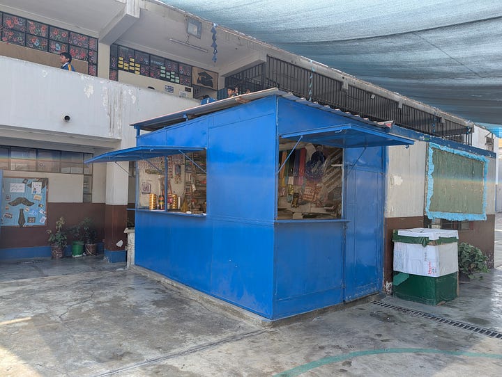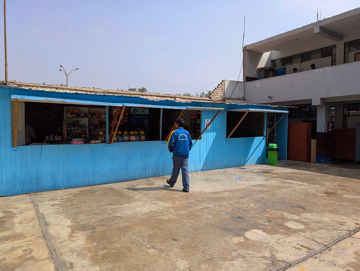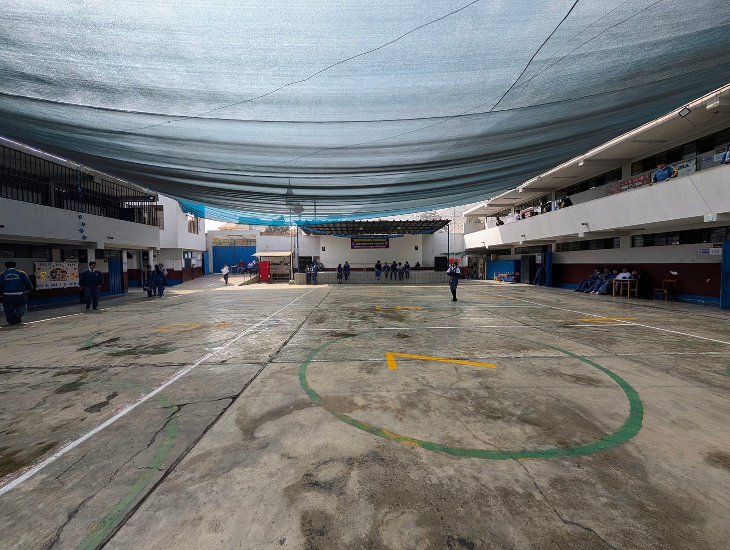 The school is completely enclosed by high concrete walls. There is no front yard or green space leading up to the building. From the outside, it is impossible to see inside. A steel entrance gate opens to reveal a large open-air courtyard, a layout common in Peruvian schools. One end of the courtyard holds a raised stage, while the other includes a snack kiosk and a supply store for teachers.